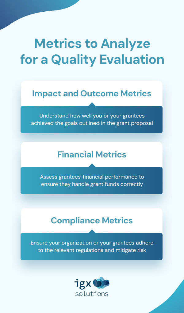 When you begin the evaluation process, you’ll decide which metrics and key performance indicators you’ll use to assess the results. These metrics should clearly reflect both your goals and those of your grantees.